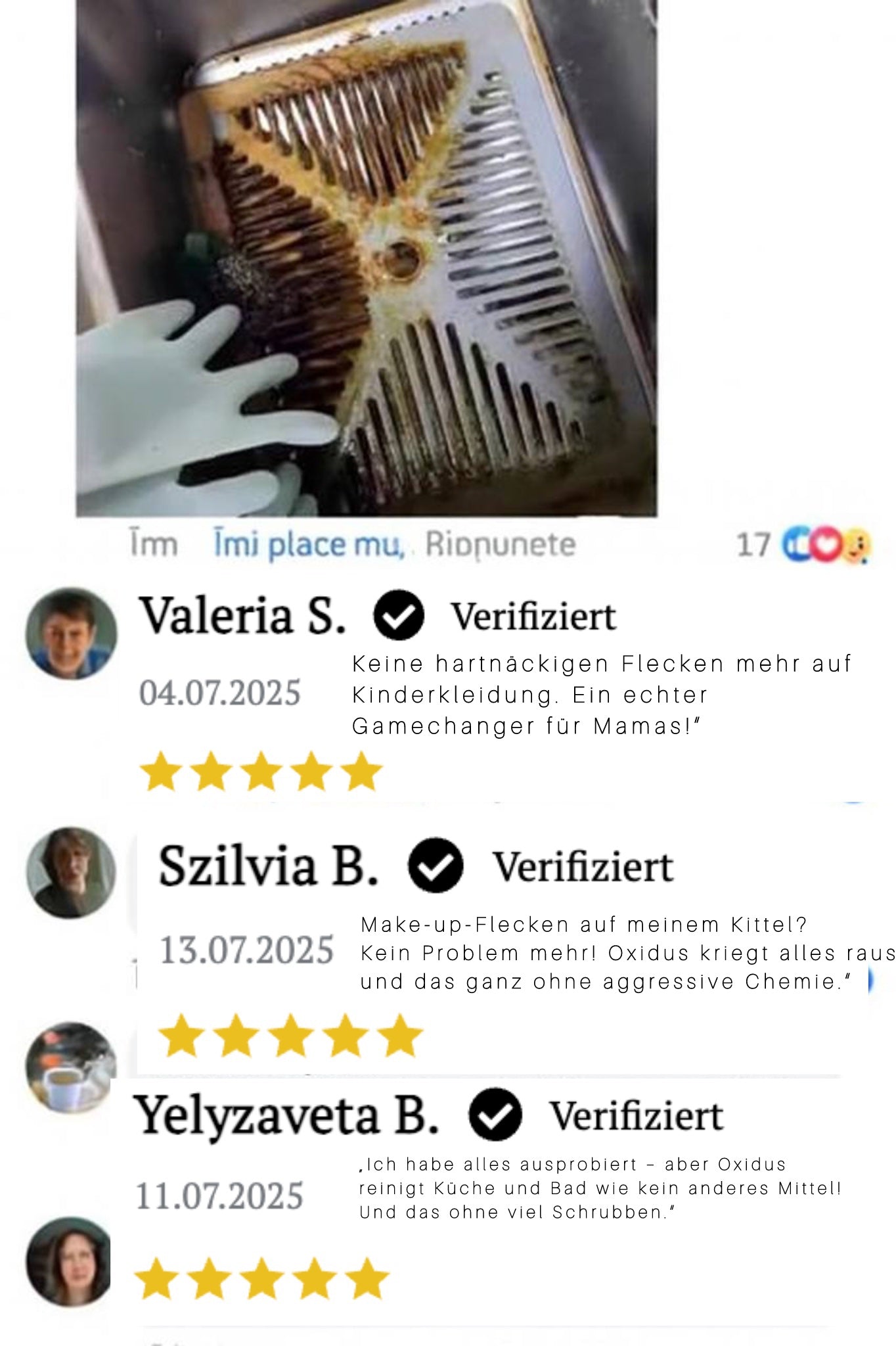 Alle Oxydus-Produkte werden mit modernen Technologien hergestellt. Sie enthalten ausschließlich umweltfreundliche Komponenten und neutrale Tenside, die für den menschlichen Körper unbedenklich sind und die Umwelt nicht schädigen.